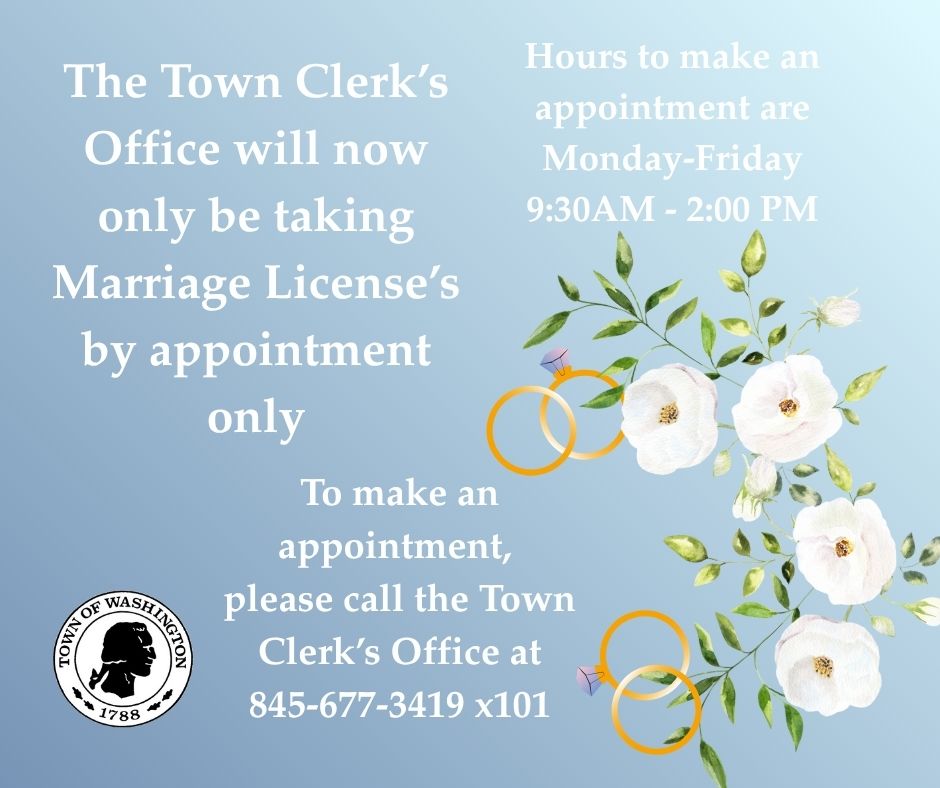 The Town Clerk’s office will now only be accepting Marriage License applications through APPOINTMENT ONLY. Hours to obtain a Marriage License are Monday-Friday, 9:30 AM – 2:00 PM. To make an appointment please call the Town Clerk’s Office at 845-677-3419 x101.