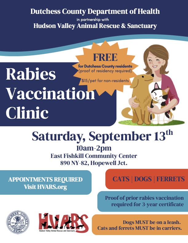The Dutchess County Department of Health, in partnership with the Hudson Valley Animal Rescue & Sanctuary is hosting a Rabies Vaccination Clinic on Saturday, September 13th from 10AM – 2PM at the East Fishkill Community Center. For more information, please consult the flyer below: