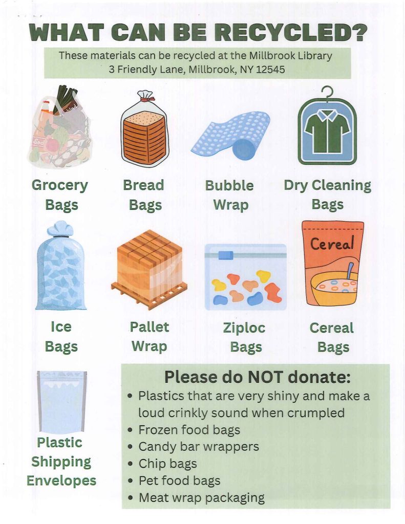 On behalf of the Millbrook Library, we are now accepting plastic that can be recycled that will go to a good cause for our Library. The Millbrook Library needs to collect 1,000lbs of plastic in order for a bench to be donated in their pollinator garden. In the lobby of the Town Hall there is a bag that you can place your recyclable plastic that we will give to our Library for this great cause!