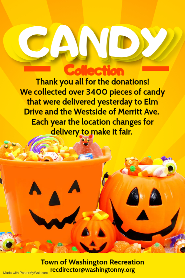 Thank you for all the donations! We collected over 3,400 pieces of candy that were delivered yesterday to Elm Drive and the Westside of Merrit Avenue. Each year the location changes for delivery to make it fair!