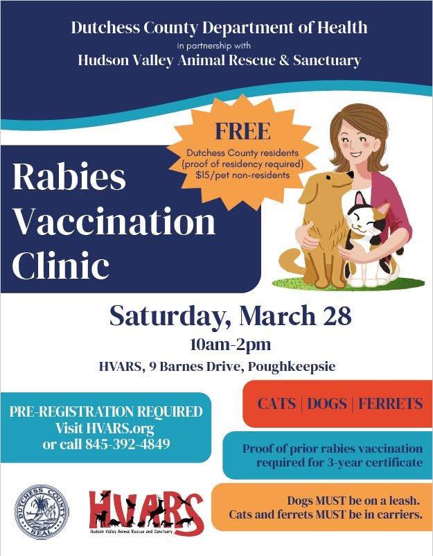 Dutchess County will host a free rabies vaccination clinic for pets on Saturday, March 28, from 10 a.m. to 2 p.m. at the Hudson Valley Animal Rescue & Sanctuary clinic, 9 Barnes Drive in Poughkeepsie. The clinic is open to dogs, cats, and domestic ferrets ages 3 months and older. Vaccinations are free for Dutchess County residents and $15 per pet for non-residents. Pre-registration is required and opens online March 11. Dogs must be on a leash, and cats and ferrets must be in carriers.