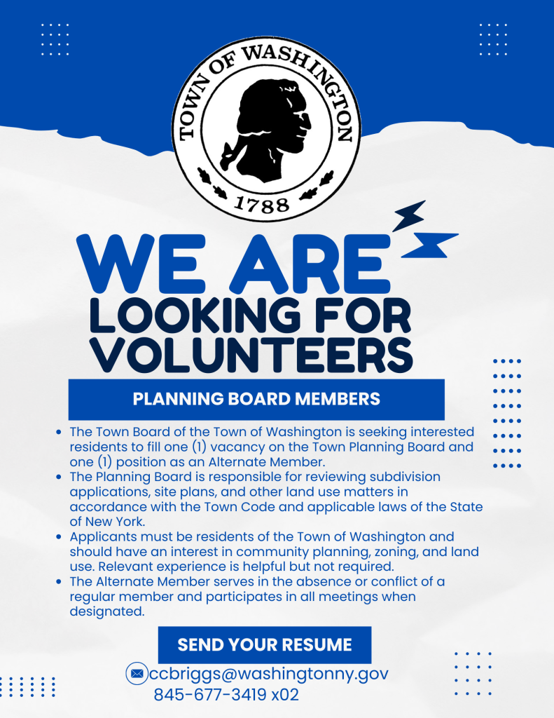 The Town of Washington is currently seeking dedicated and community-minded individuals to serve on its Planning Board. This is a valuable opportunity for residents who are interested in shaping the future development, land use, and overall character of the town.