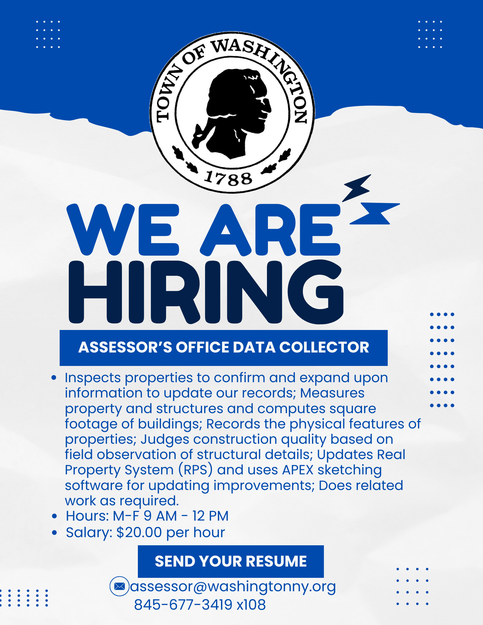 For all job inquires please call the Town Clerk's office at 845-677-3419, x100 or email ccbriggs@washingtonny.org